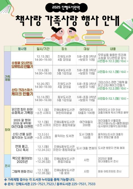[뉴스스텝] 창원특례시 진해도서관과는 연말을 맞아 가족과 함께 즐길 수 있는 따뜻하고 풍성한 ‘2025 책사랑 가족사랑 행사’를 진해도서관 및 동부도서관에서 12월 한 달간 운영한다.