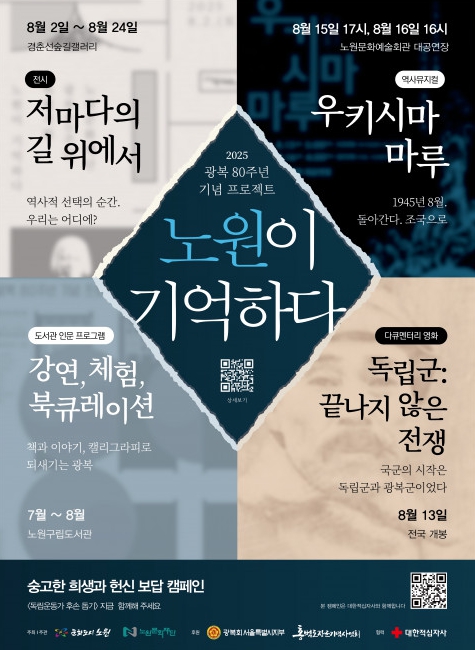 [뉴스스텝] 서울시 노원문화재단은 광복 80주년을 맞아 독립의 의미를 되새기고, 그 정신을 시민과 함께 나누기 위한 문화예술 프로젝트 ‘노원이 기억하다’를 추진한다. 이번 프로젝트는 전시, 공연, 영화, 강연, 북큐레이션·체험프로그램 등 다양한 장르를 통해 광복의 역사적 순간을 오늘의 삶 속에서 체험하고 기억할 수 있도록 기획됐다.