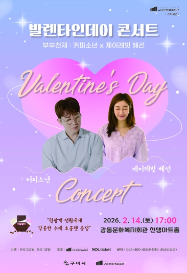 [뉴스스텝] 구미시는 오는 2월 14일 오후 5시, 강동문화복지회관 천생아트홀에서 발렌타인데이 콘서트〈부부천재 : 커피소년 x 제이레빗 혜선〉을 개최한다.