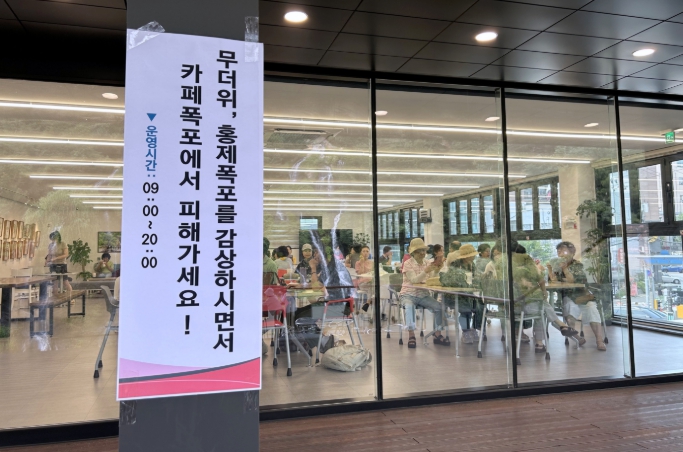 ▲ 많은 시민이 28일 ‘카페(CAFE) 폭포’ 2층에서 더위를 피하고 있다. |