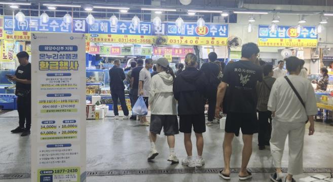 이번 행사는 해양수산부 지원으로 수산물 소비촉진과 도매시장 이용 활성화를 위해 마련된 것으로, 수산동 26개 점포가 참여해 국내산 수산물 구매 시 구매금액의 일부를 온누리상품권으로 즉시 환급하는 혜택을 선보였다.