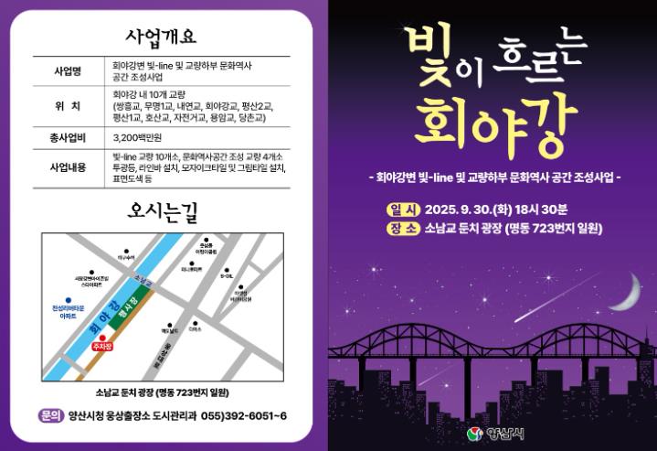 양산시 관계자는 “이번 경관조명 설치는 회야강 르네상스 프로젝트의 성공적인 시작을 알리는 신호탄”이라며 “빛으로 다시 태어난 회야강이 시민들에게는 편안한 휴식처가 되고, 양산을 대표하는 새로운 야경 명소로 자리매김하길 기대한다”고 밝혔다.