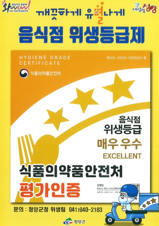 군 관계자는 “군민이 안심하고 이용할 수 있는 외식환경을 만들기 위해 위생등급제 지정을 지속 확대하고, 신청 업소가 등급을 받을 수 있도록 적극 지원하겠다”고 밝혔다.
