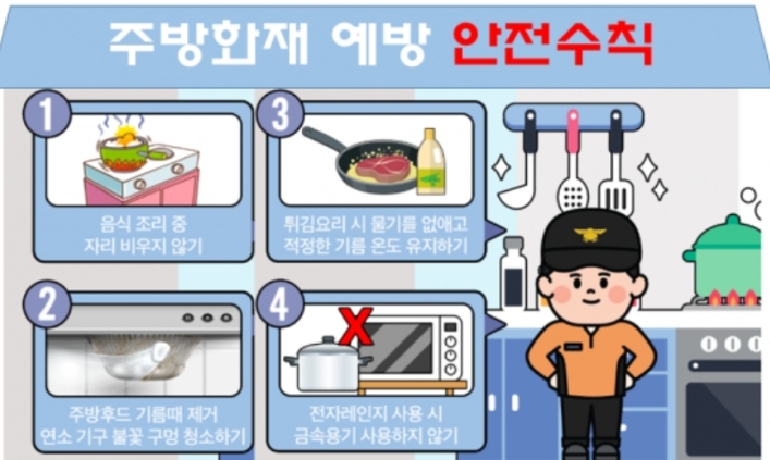 이에 소방서는 조리 중 자리를 절대 비우지 말고, 튀김류 조리 시에는 온도를 수시로 확인하며 화재 발생에 대비해 덮을 수 있는 뚜껑이나 소화기·K급 소화기를 가까이 비치할 것을 강조했다.