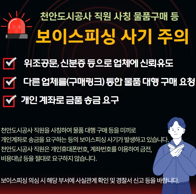 [뉴스스텝] 천안도시공사가 최근 공사 직원을 사칭한 보이스피싱 사례가 발생함에 따라 피해 예방을 위한 주의를 당부했다.