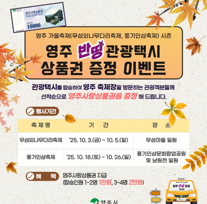 해당 이벤트는 관외 관광객을 대상으로 하며, 축제 기간 중 관광택시를 이용해 지정 축제장을 방문하면 영주사랑상품권을 받을 수 있다.