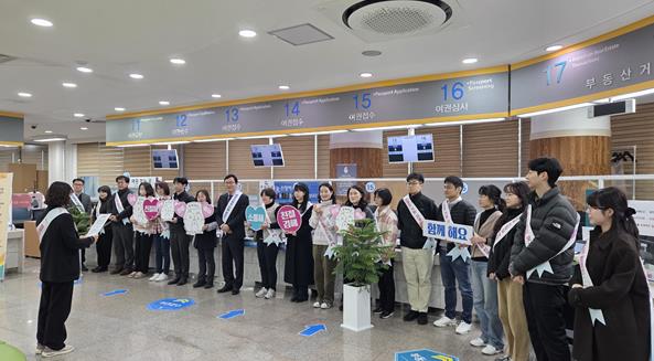 민원실 직원 20여명이 참여한 이번 캠페인은 민원실을 찾는 시민이 보다 친절한 응대를 받을 수 있도록 공무원의 서비스 마인드를 제고하고 민원인의 만족도를 높이기 위해 마련됐다.