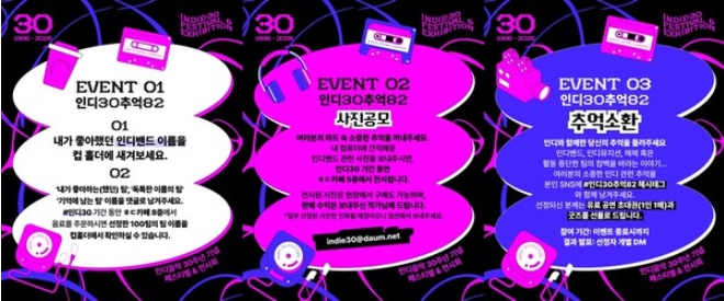 오는 9월 25일과 26일 양일간 서울 마포구 ㅎㄷ(홍대)카페에서 '인디 30주년 기념 페스티벌 & 전시회'가 개최된다. 특히 이번 행사에서는 인디 팬들과 함께 하는 참여형 캠페인 '인디30 추억82'가 진행된다.
