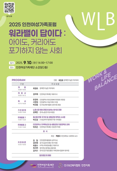 인천여성가족재단 김미애 대표이사는 “이번 포럼을 통해 일·생활균형 문화 확산을 위한 다양한 주체들과의 논의가 활발히 이루어지길 기대한다”며 “앞으로도 재단과 함께 워라밸 사회를 선도해갈 수 있도록 지속적인 관심과 협력을 부탁드린다”고 말했다.
