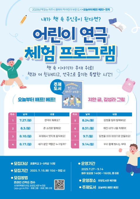 [뉴스스텝] 제주시 우당도서관은 2025년 ‘책 읽는 제주시 올해의 책’ 어린이 부문 선정 도서를 바탕으로 한 연극 프로그램 ‘내가 책 속 주인공이 된다면?’ 에 참여할 어린이를 모집한다.
