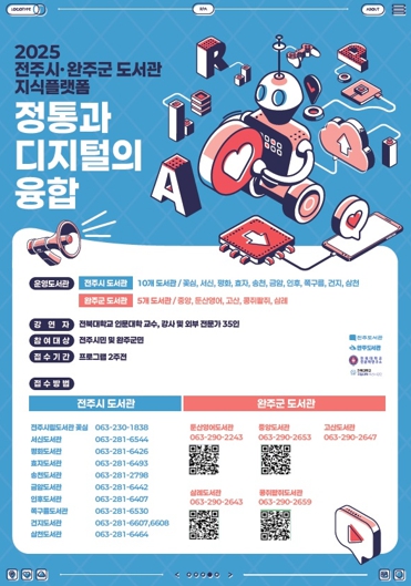 전주시는 오는 15일부터 8월 28일까지 10개 시립도서관에서 전북대학교와 연계한 ‘전주시 도서관 지식플랫폼: 정통과 디지털의 융합’ 프로그램을 운영한다고 14일 밝혔다.