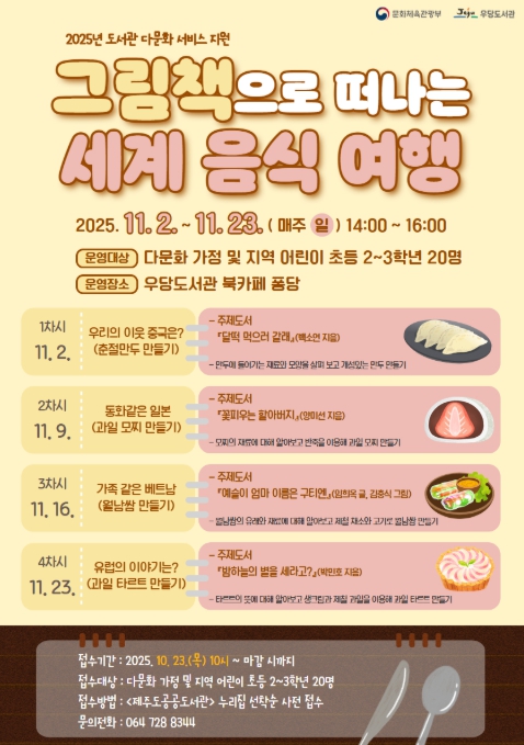 [뉴스스텝] 제주시 우당도서관은 2025년 도서관 다문화 서비스 지원 사업인 ‘그림책으로 떠나는 세계 음식 여행’ 프로그램 참여자를 10월 23일부터 선착순 모집한다.