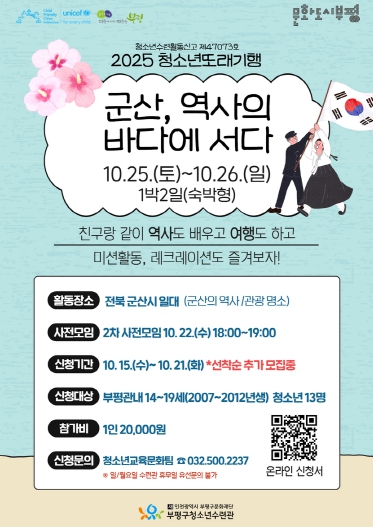 [뉴스스텝] 부평구 청소년수련관은 오는 21일까지 ‘2025 청소년 또래기행 - 군산, 역사의 바다에 서다’에 참가할 청소년을 모집한다.
