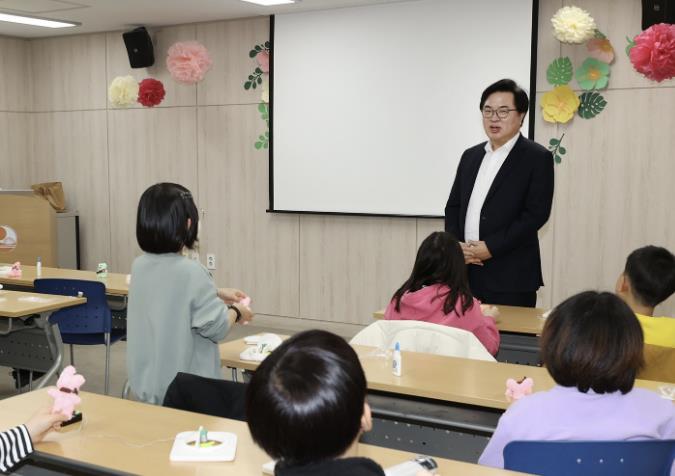 | ▲ 박일하 동작구청장이 지난 1월, 신대방2동 주민센터에서 열린 ‘윈터스쿨(Winter School)’에 참석해 아이들과 이야기하고 있다. |