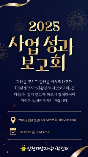 [뉴스스텝] 인천계양지역자활센터(센터장 한경주)는 2025년 한 해 동안 추진한 자활사업의 성과를 공유하고 참여주민을 격려하기 위해 ‘2025년 사업성과 보고회’를 오는 12월 12일 오후 5시 CN웨딩홀 계산점에서 개최한다고 밝혔다.