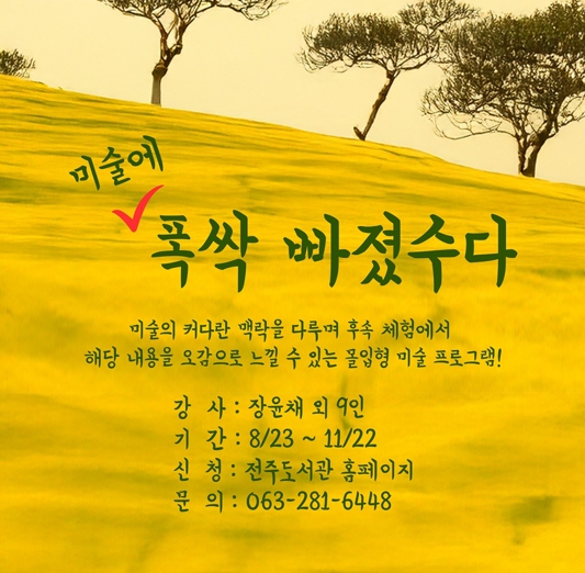 [뉴스스텝] 전주시 금암도서관은 오는 8월 23일부터 11월 22일까지 매주 토요일, 총 11회에 걸쳐 ‘미술에 폭싹 빠졌수다’ 프로그램을 운영한다.