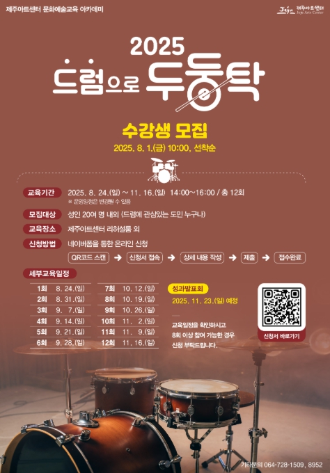 [뉴스스텝] 제주아트센터는 성인을 대상으로 운영하는 문화예술교육 아카데미 ‘2025 드럼으로 두둥탁!’ 수강생을 모집한다.