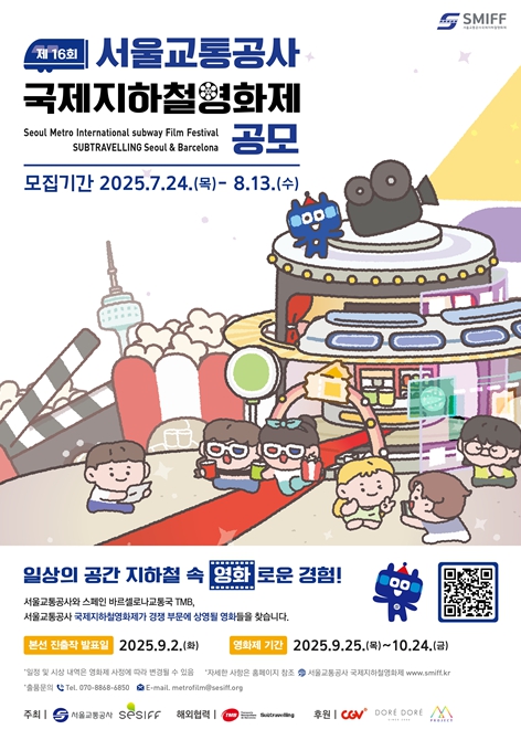 [뉴스스텝] 서울교통공사가 지하철과 초단편영화에 관심 있는 시민을 대상으로'제16회 서울교통공사 국제지하철영화제(Seoul Metro International Film Festival(SMIFF))'출품작을 공개 모집한다. 공모 기간은 7월 24일부터 8월 13일까지다.