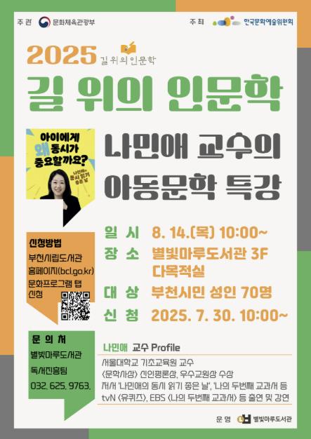 [뉴스스텝] 부천시는 8월 14일 오전 10시, 부천시립별빛마루도서관에서 서울대학교 나민애 교수를 초청해 아동문학 특강을 연다고 밝혔다.