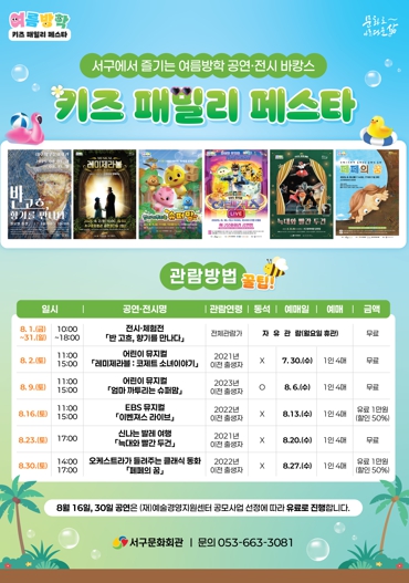 [뉴스스텝] 서구문화회관은 올해 유난히도 더운 여름, 일상에 지쳐있는 어린이 가족들을 위해 8월 한 달간‘여름방학! 키즈 패밀리 페스타’를 개최하여 문화예술로 웃고 즐기고 추억을 남길 수 있는 기회를 제공하고자 다양한 공연과 전시·체험전을 선보인다.