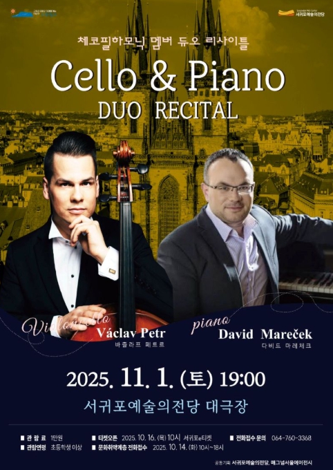 [뉴스스텝] 서귀포시는 11월 1일 오후 7시, 서귀포예술의전당 대극장에서 체코필하모닉오케스트라 멤버 '첼로 & 피아노 듀오 리사이틀'을 개최한다고 밝혔다.