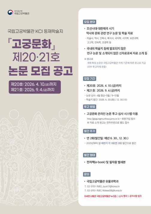 [뉴스스텝] 국가유산청 국립고궁박물관은 조선시대와 대한제국기의 역사·문화 연구를 활성화하기 위해 박물관에서 매년 발간하는 학술지 『고궁문화』 제20호와 제21호에 수록할 논문을 모집한다. 제20호는 올해 6월 30일, 제21호는 12월 30일 발간 예정이며, 논문 접수 마감일은 각각 4월 10일과 9월 4일이다.
