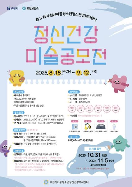 [뉴스스텝] 부천시와 부천시아동청소년정신건강복지센터는 아동청소년 정신건강에 대한 공감대 확산과 인식 개선을 위해 9월 12일오후 6시까지 ‘제8회 정신건강 미술공모전’을 연다. 공모전은 부천시에 거주하는 유아와 아동·청소년 누구나 참여할 수 있다.