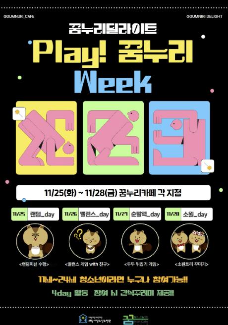 [뉴스스텝] 의왕시청소년재단 산하 의왕시청소년수련관 꿈누리카페(▲고천점( 문화공원로 33), ▲내손점(복지로 109), ▲오전점(찬우물길 11), ▲백운밸리점(백운중앙로 74, 총 4개 지점))는 오는 11월 25일부터 28일까지 4일간 꿈누리딜라이트 『Play! 꿈누리 Week』를 진행한다고 밝혔다.