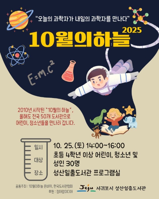 [뉴스스텝] 서귀포시성산일출도서관은 오는 10월 25일 오후 2시부터 4시까지 과학자들의 재능기부로 진행되는 전국 과학 강연 행사 ‘10월의 하늘’을 운영한다.