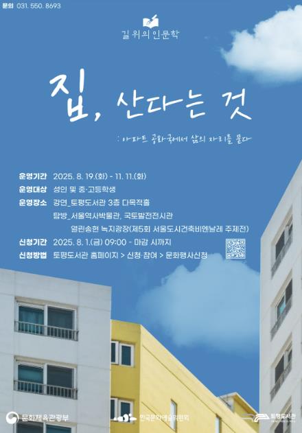 [뉴스스텝] 구리시 토평도서관이 문화체육관광부가 주최하고 한국문화예술위원회가 주관하는 ‘2025년 길 위의 인문학’ 공모 사업에 선정되어, 오는 8월부터 ‘집, 산다는 것 – 아파트 공화국에서 삶의 자리를 묻다’ 프로그램을 운영한다.