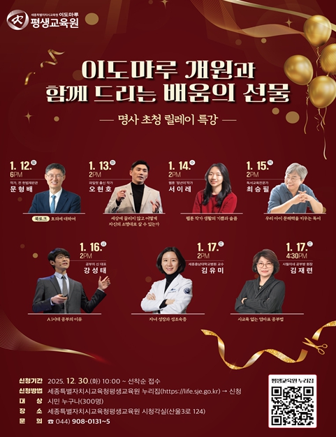 [뉴스스텝] 세종특별자치시교육청평생교육원(원장 송정순)은 2026년 1월 개원을 기념해 1월 12일부터 17일까지 6일간 개원 주간을 운영하고, 개원 행사의 일환으로 ‘명사 초청 릴레이 특강’을 매일 개최한다.