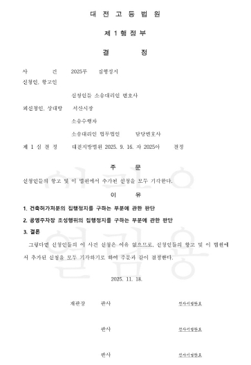 [뉴스스텝] 충남 서산시가 추진하는 예천지구 공영주차장(초록광장) 조성사업과 관련하여 일부 시민이 제기한 건축허가처분 집행정지 항고에 대해 대전고등법원이 18일 기각 결정을 내렸다.