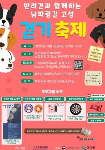 이상근 고성군수는 “이번 걷기축제는 반려동물과 함께하는 관광 콘텐츠를 통해 고성군의 아름다운 자연과 건강한 반려문화를 널리 알리는 계기가 될 것”이라며, “많은 분들이 가족 같은 반려견과 소중한 추억을 만들고, 고성의 매력을 만끽하길 바란다”라고 밝혔다.