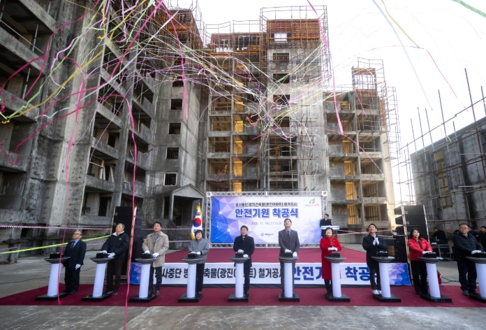 [뉴스스텝] 제천시는 19일 도심 속 흉물로 장기간 방치된 건축물(광진아파트)의 철거공사 안전기원 착공식을 개최했다.
