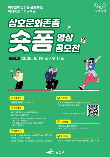 한편, 숏폼 영상공모전에 관한 자세한 내용은 광산구 누리집(뉴스‧소식→새소식→광산구 상호문화존중 숏폼 영상공모전)에서 확인할 수 있다.