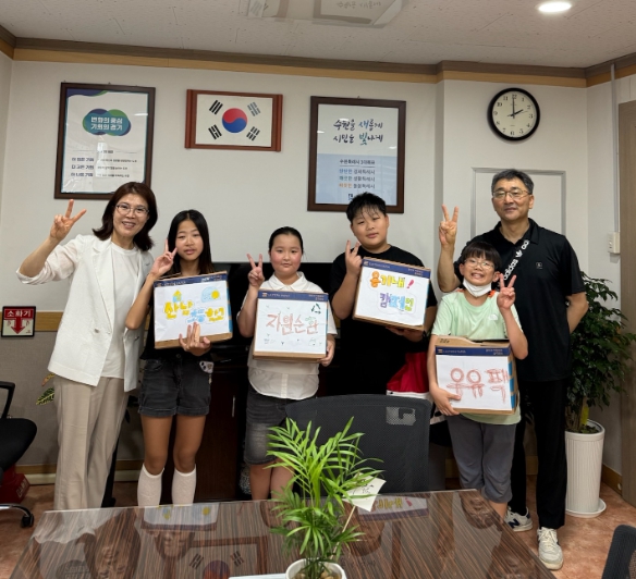 [뉴스스텝] 수원시 영통구 매탄2동은 지난 23일 산남초등학교 6학년 학생들이 ‘용기 내 캠페인’의 일환으로 직접 수거한 우유팩과 폐건전지 등 유용 생활 폐자원을 행정복지센터에 전달하며 환경 보호 실천에 앞장섰다고 밝혔다.