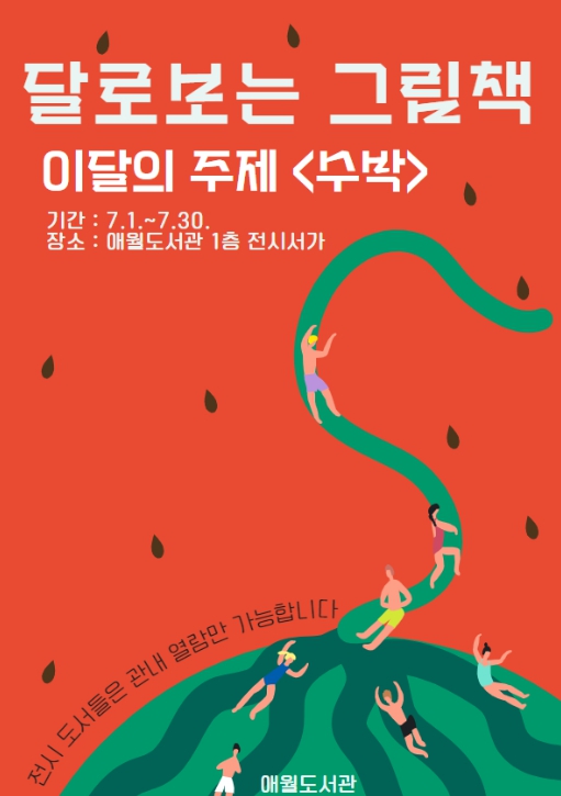 애월도서관은 ‘달로 보는 그림책’을 주제로 1층 로비에서 큐레이션을 진행 중이다. 7월의 테마는 무더위를 날릴 ‘수박’이다. 이어서 8월 ‘생일’, 9월 ‘마법’, 10월 ‘지구’, 11월 ‘소원’, 12월 ‘크리스마스’ 등 아이들의 상상력을 자극하는 주제로 큐레이션이 예정돼 있다.