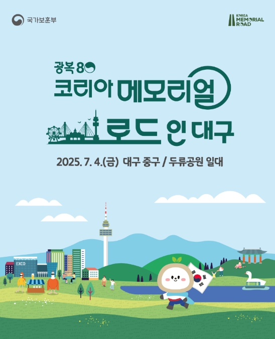 [뉴스스텝] 국가보훈부는 광복 80주년을 맞아 전국의 독립운동 사적지 등 보훈 순례길을 따라 걷는 ‘코리아 메모리얼 로드(Korea Memorial Road)’의 두 번째 행사로 4일 대구 중구에서 ‘광복80 코리아 메모리얼 로드 인 대구’를 개최한다고 밝혔다.