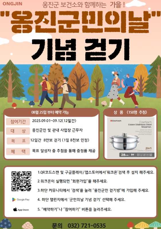 한편, 9월 걷기 챌린지 관련 자세한 사항은 옹진군보건소 건강증진과로 문의하면 된다.