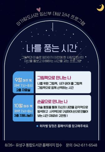 [뉴스스텝] 대전 유성구는 9월부터 10월까지 아가랑도서관에서 임신부를 위한 감성 프로그램 ‘나를 품는 시간’을 운영한다.