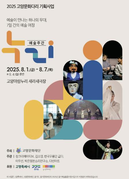 [뉴스스텝] 고양문화재단은 지역 예술인과 시민을 잇는 핵심 사업인 '고양문화다리'의 새로운 기획으로 2025년 고양문화다리 예술주간 '누리'를 개최한다. 이번 행사는 고양시민의 삶에 예술을 가까이하고 문화를 연결하는 등 예술의 사회적 가치를 확산시키기 위해 마련됐다.