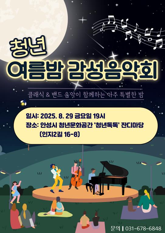 김보라 안성시장은 “도심 속 잔디마당에서 열리는 이번 감성음악회가 청년과 시민 모두에게 특별한 추억을 선사하길 바란다”며 “앞으로도 청년문화공간 ‘청년톡톡’을 거점으로 한 다양한 야간문화 프로그램을 지속적으로 추진하겠다”고 말했다.