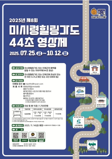 [뉴스스텝] 인제군은 국도44호선 일원의 자연경관과 관광자원을 홍보하기 위한 ‘제8회 미시령 힐링가도 44초 영상제’를 개최한다고 밝혔다.