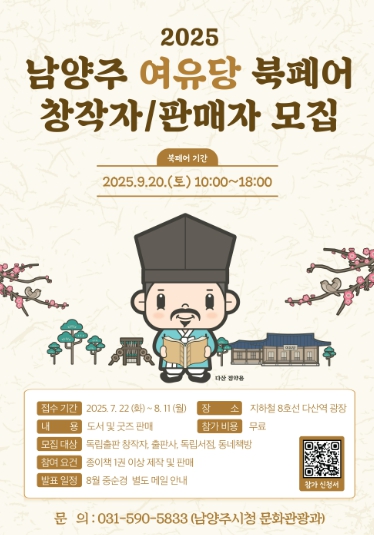 [뉴스스텝] 남양주시는 9월 20일 다산역 광장에서 열리는 ‘2025 남양주 여유당 북페어’에 참가할 창작자와 판매자를 7월 22일부터 8월 11일까지 모집한다.