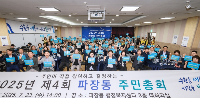 [뉴스스텝] 수원시 파장동 주민자치회는 지난 23일, 파장동 행정복지센터 대회의실에서 ‘2025년 파장동 주민총회’를 성황리에 개최했다. 이번 총회는 마을 의제를 주민 스스로 제안하고 결정하는 공론의 장으로, 무더위에도 100여 명의 주민들이 참석해 뜨거운 관심을 보였다.