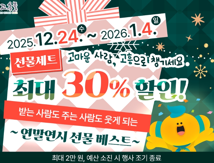 [뉴스스텝] 고흥군이 운영하는 온라인 농수축특산물 쇼핑몰 ‘고흥몰’이 연말연시를 맞아 2026년 1월 4일까지 ‘고마운 사람, 고흥으로 챙기세요 – 연말연시 선물 베스트’ 기획전을 진행한다.