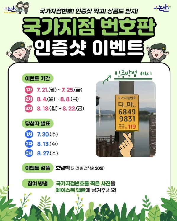 이번 이벤트는 7월 21일부터 8월 22일까지 총 3차에 걸쳐 격주로 진행되며, 논산시 전역에 설치된 국가지점번호판과 함께 사진을 찍어 논산시 공식 페이스북에 인증 댓글을 작성해 응모할 수 있다.