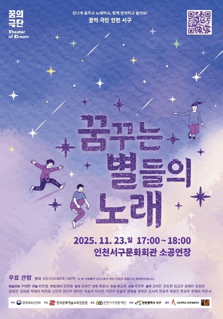 [뉴스스텝] 인천서구문화재단이 오는 11월 23일 오후 5시, 인천서구문화회관 소공연장에서 ‘2025년 꿈의 극단 인천 서구 정기공연 - 꿈꾸는 별들의 노래’를 개최한다.