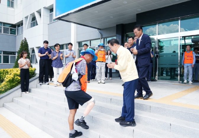 ▲ 천시는 지난 24일, 2025 경주 APEC 정상회의 성공 개최를 기원하며 도보 종주 중인 ‘왼발박사’ 이범식 교수를 시청 로비에서 환영했다. |