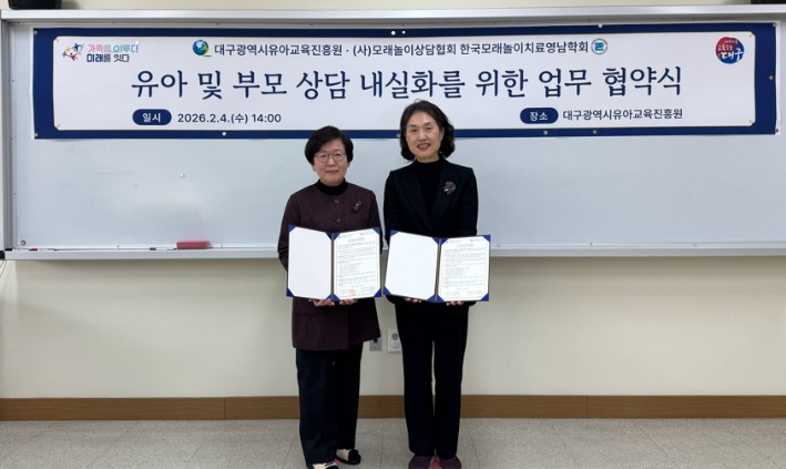 [뉴스스텝] 대구시교육청 유아교육진흥원은 2월 4일, 사단법인 모래놀이상담협회 한국모래놀이치료 영남학회, 대구가톨릭대학교 언어청각치료학과와 유아 및 부모 상담 내실화를 위한 업무협약(MOU)을 체결했다.